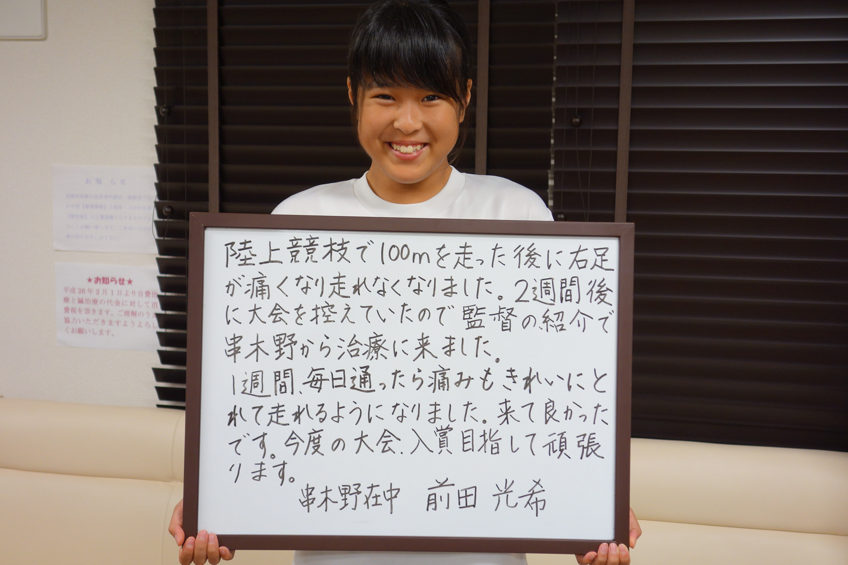 先日、串木野陸上少年団の前田光希ちゃんが1時間近くかけて治療に来てくれました。