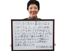 阿久根院在住 三佐子様10年ほど長らく鼻炎に悩まされてきました。2〜3月の時季にはスギ花粉による花粉症の合わせておこりとてもきつかったのですが大田整骨院で鼻炎の施術をしたら症状が出ず毎年行っていた耳鼻科にも行かずに過ごせました。大田整骨院で施術をして良かったです。