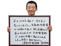 津奈木中野球部 濱田朝陽様足をつくもの痛くて、引きずって歩いていました。有痛性外脛骨は、以前にもあって、鍼施術など色々やりましたが、大田整骨院で2回の施術で痛みがとれました。本当に助かりました。
